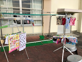 6年生の家庭科授業です。自分で持ってきた物を学校で洗濯をしました。グループでわいわい言いながら楽しく洗っていました。